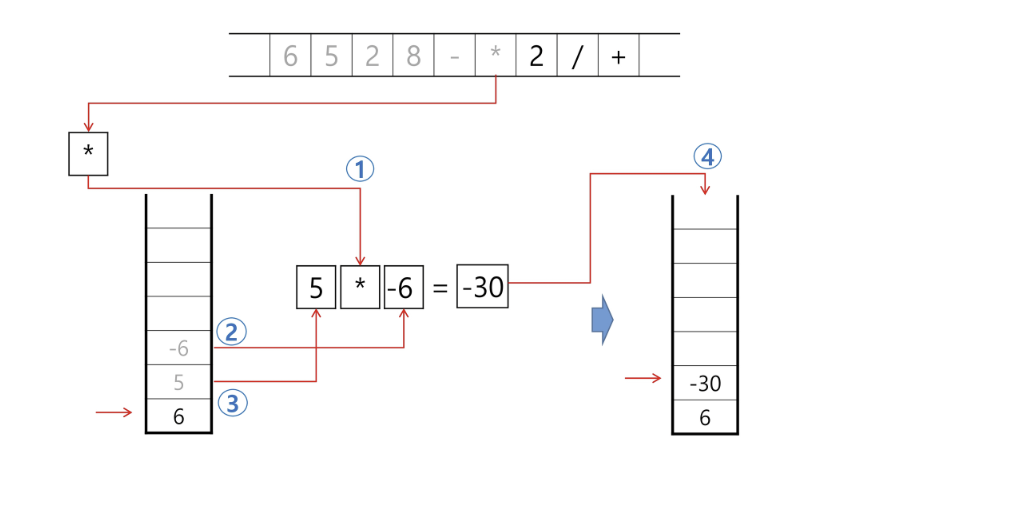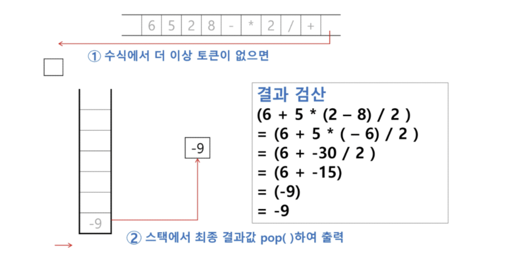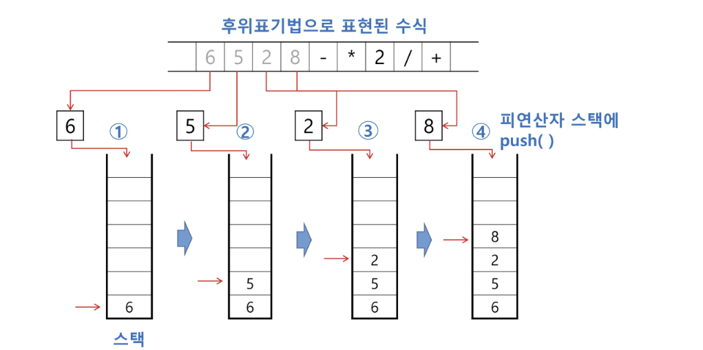 - 연산자를 만나면 필요한 만큼의 피연산자를 스택에서 pop 하여 연산하고, 연산결과를 다시 스택에 psuh 합니다.