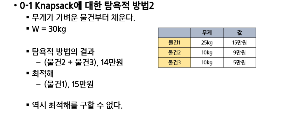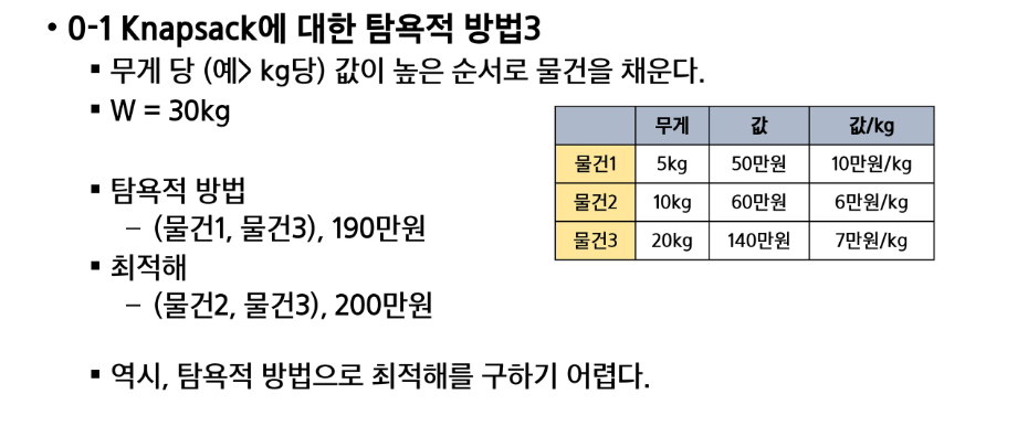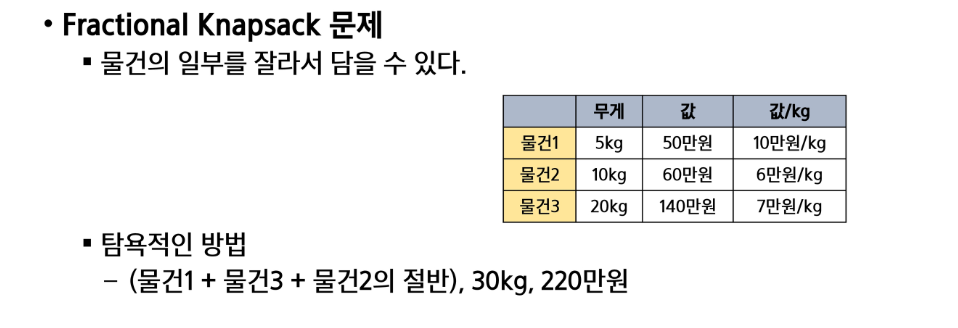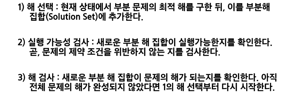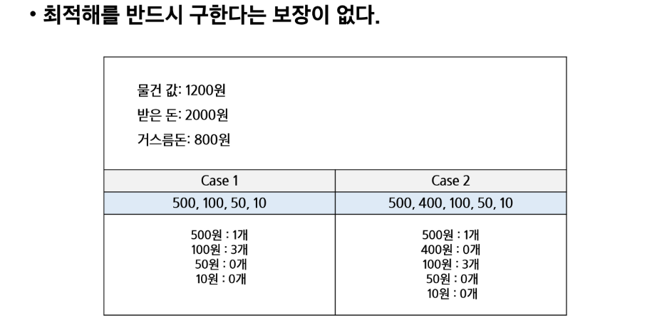- 각 선택 시점에서 이루어지는 결정은 지역적으로 최적이지만, 그 선택들을 계속 수집하여 최종적인 해달을 만들었다고 해서, 그것이 최적이라는 보장은 없습니다.