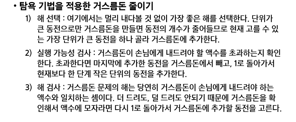 - 탐욕 알고리즘은 최적해를 구하는 데 사용되는 근시안적인 방법