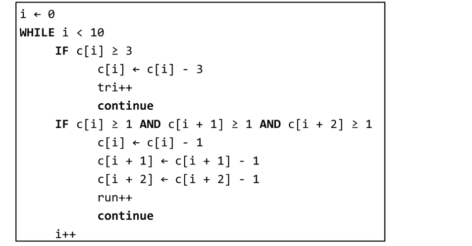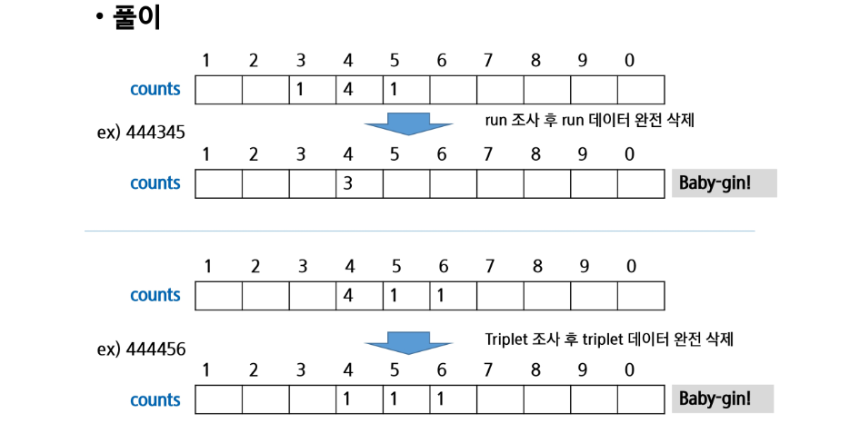 - counts 배열의 각 원소를 체크하여 run과 triplet 및 baby-gin 여부를 판단합니다.