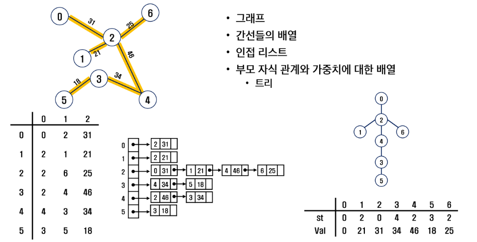 - 무방향 가중치 그래프에서 신장 트리를 구성하는 간선들의 가중치의 합이 최소인 신장 트리