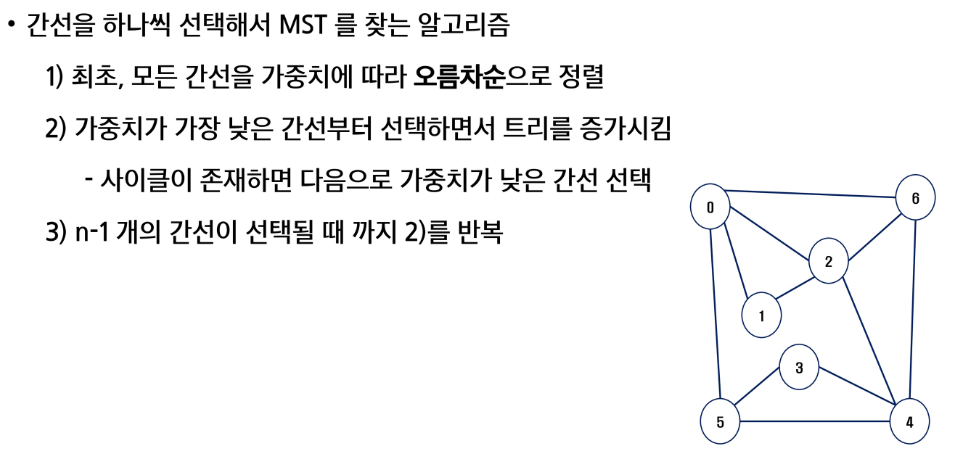 - 1) 모든 정점을 연결하는 간선들의 가중치의 합이 최소가 되는 트리