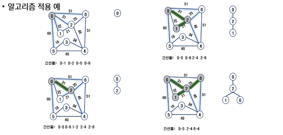 - 2) 선택한 정점과 인접하는 정점들 중의 최소 비용의 간선이 존재하는 정점을 선택