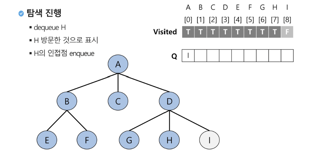 - 너비 우선탐색은 탐색 시작점의 인접한 정점들을 먼저 모두 차례로 방문한 후에, 방문했던 정점을 시작점으로 하여 다시 인접한 정점들을 차례로 방문하는 방식입니다.
