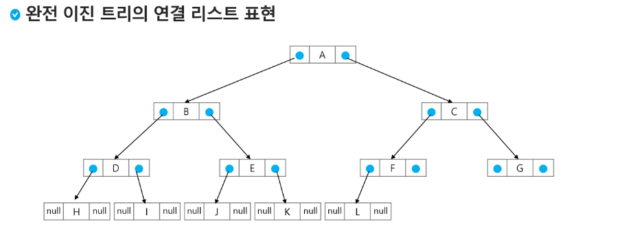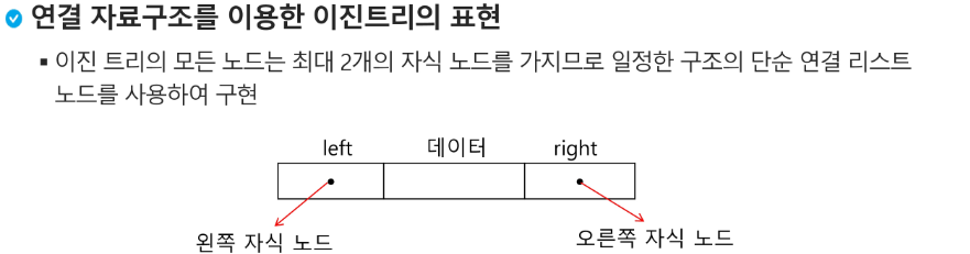 - 배열을 이용한 이진 트리의 표현의 단점을 보완하기 위해 연결리스트를 이요하여 트리를 표현할 수 있습니다.