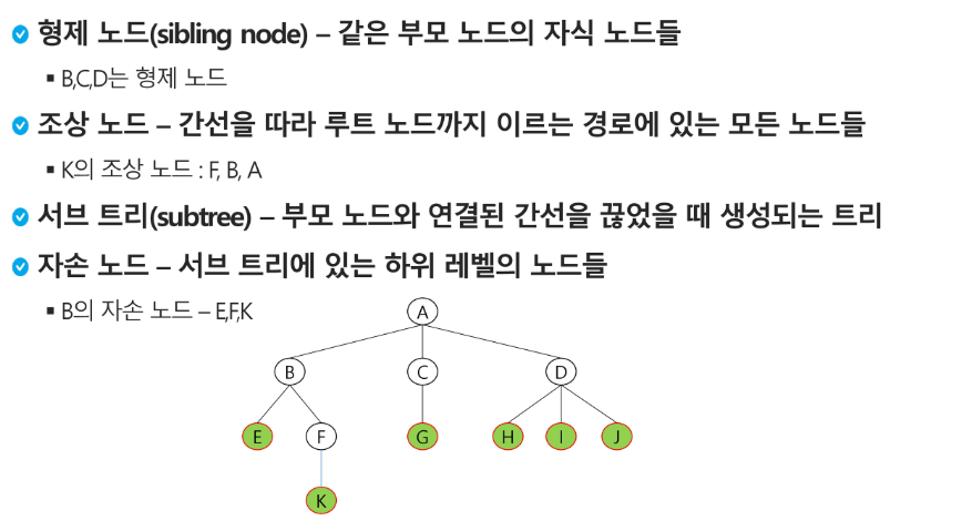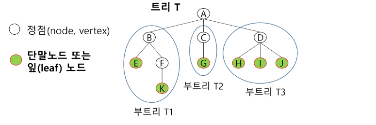 - 이들 T1, ..., TN은 각각 하나의 트리가 되며(재귀적 정의) 루트의 부 트리(subtree)라고 합니다.