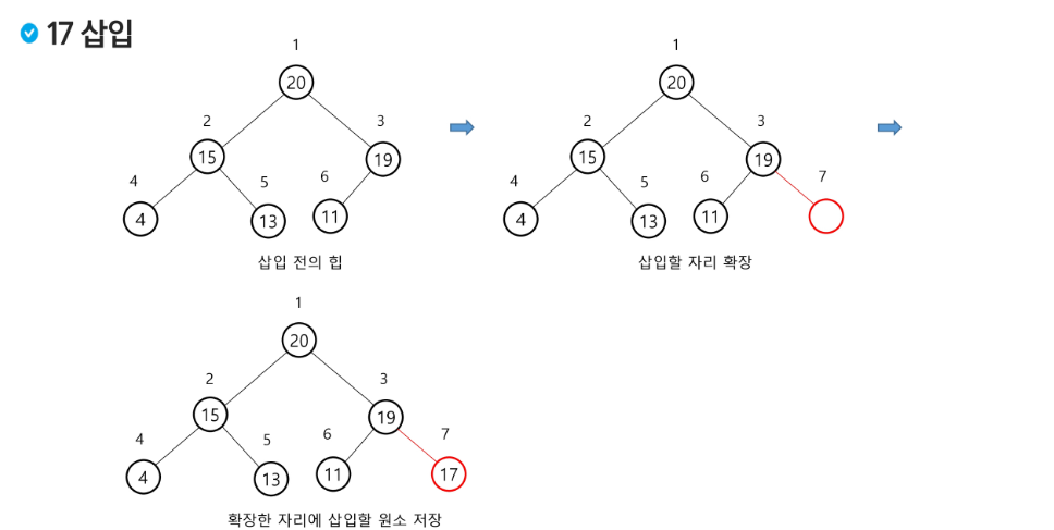- 완전 이진 트리에 있는 노드 중에서 키 값이 가장 큰 노드나 키 값이 가장 작은 노드를 찾기 위해서 만든 자료구조입니다.