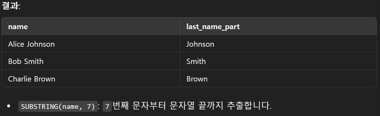"SUBSTRING" 함수는 문자열의 특정 부분을 추출하는 데 사용됩니다. 특정 위치에서 시작하여 지정된 길이만큼 문자열을 반환합니다.