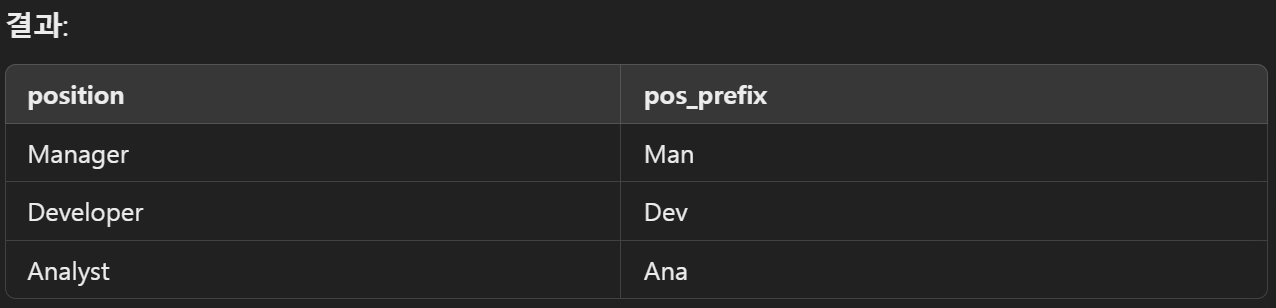 SELECT position, SUBSTRING(position, 1, 3) AS pos_prefix