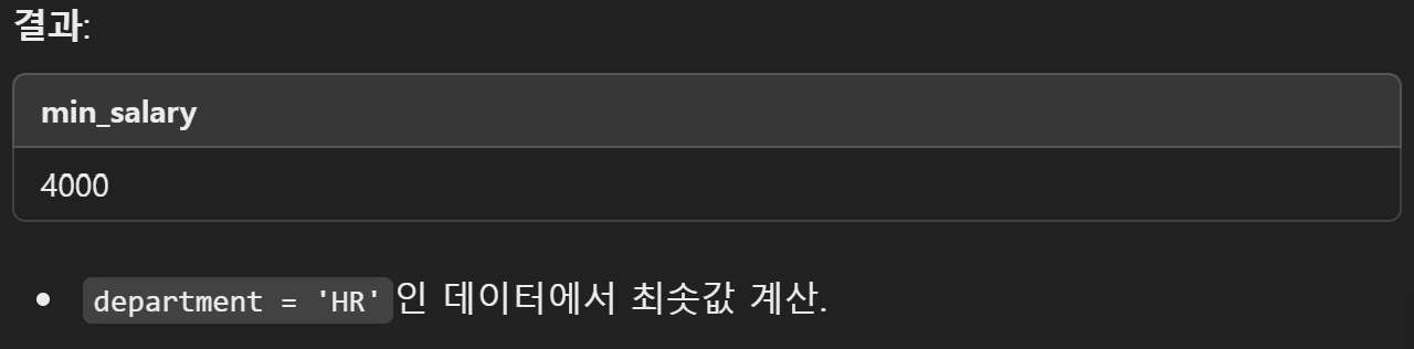 - WHERE condition: 특정 조건을 적용하여 최솟값 계산 가능.
