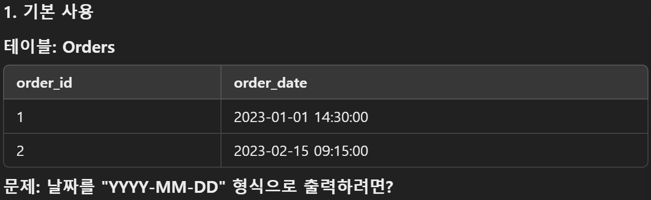 "DATE_FORMAT" 함수는 날짜 및 시간 데이터를 지정된 형식으로 변환하는 데 사용됩니다. MySQL과 같은 DBMS에서 주로 사용되며, 출력 결과를 사람이 읽기 쉽게 하거나 특정 패턴에 맞춰 변환하는 데 유용합니다.