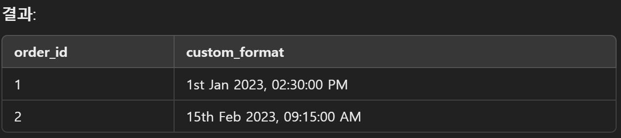 SELECT order_id, DATE_FORMAT(order_date, '%D %b %Y, %r') AS custom_format
