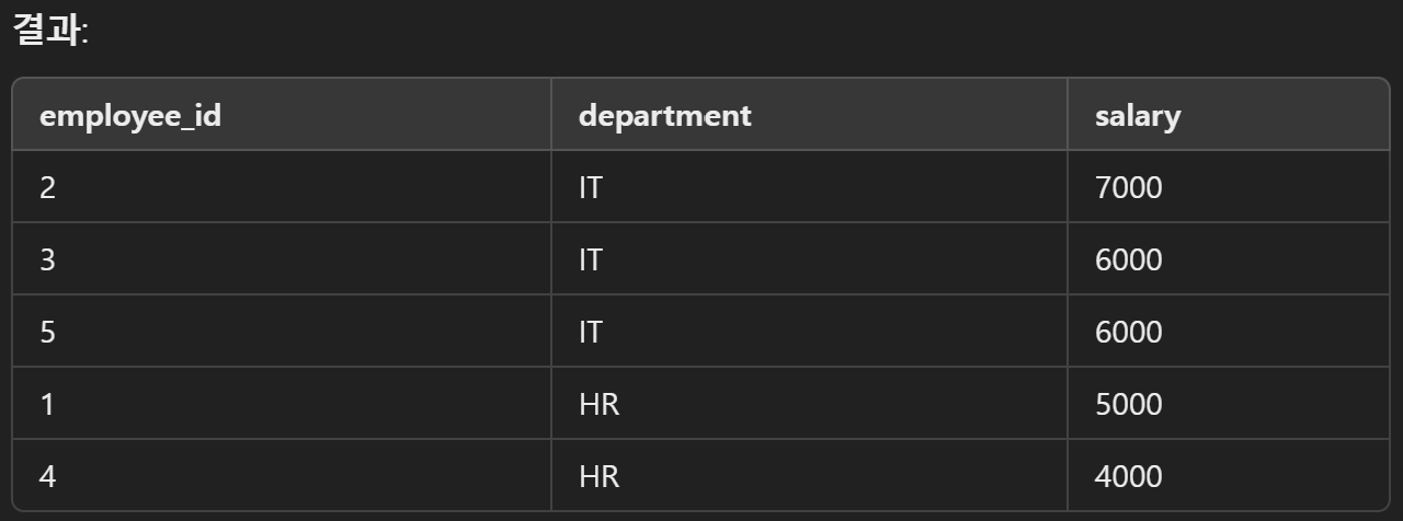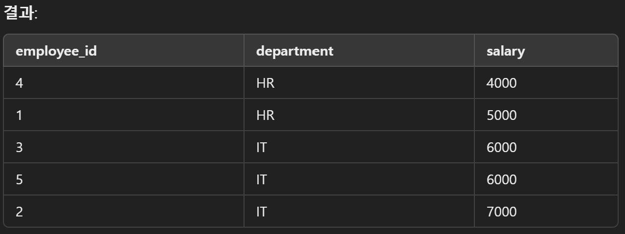 문제: salary 기준으로 내림차순 정렬하고, 동일한 salary인 경우 department 기준으로 오름차순 정렬.