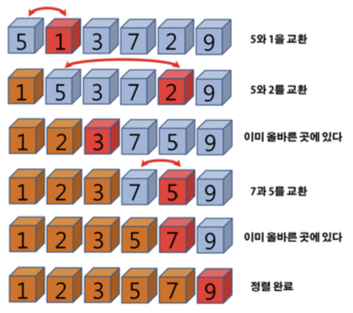 - 리스트에서 가장 작은 값을 찾아 맨 앞 요소와 교환하는 방식