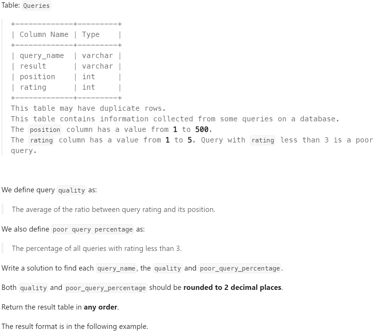 ROUND(SUM(rating / position) / COUNT(query_name), 2) AS quality,