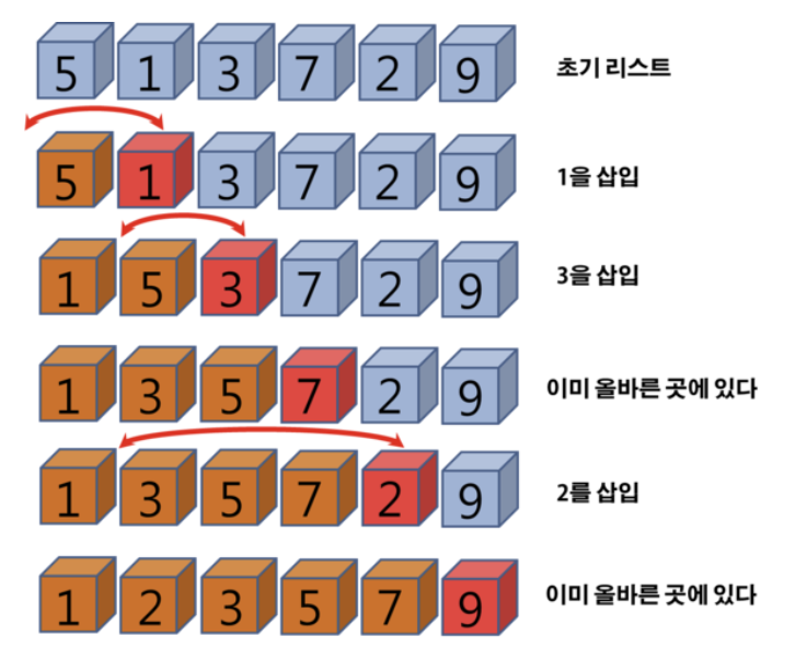 "각 요소를 적절한 위치에 삽입하며 정렬하는 방식"