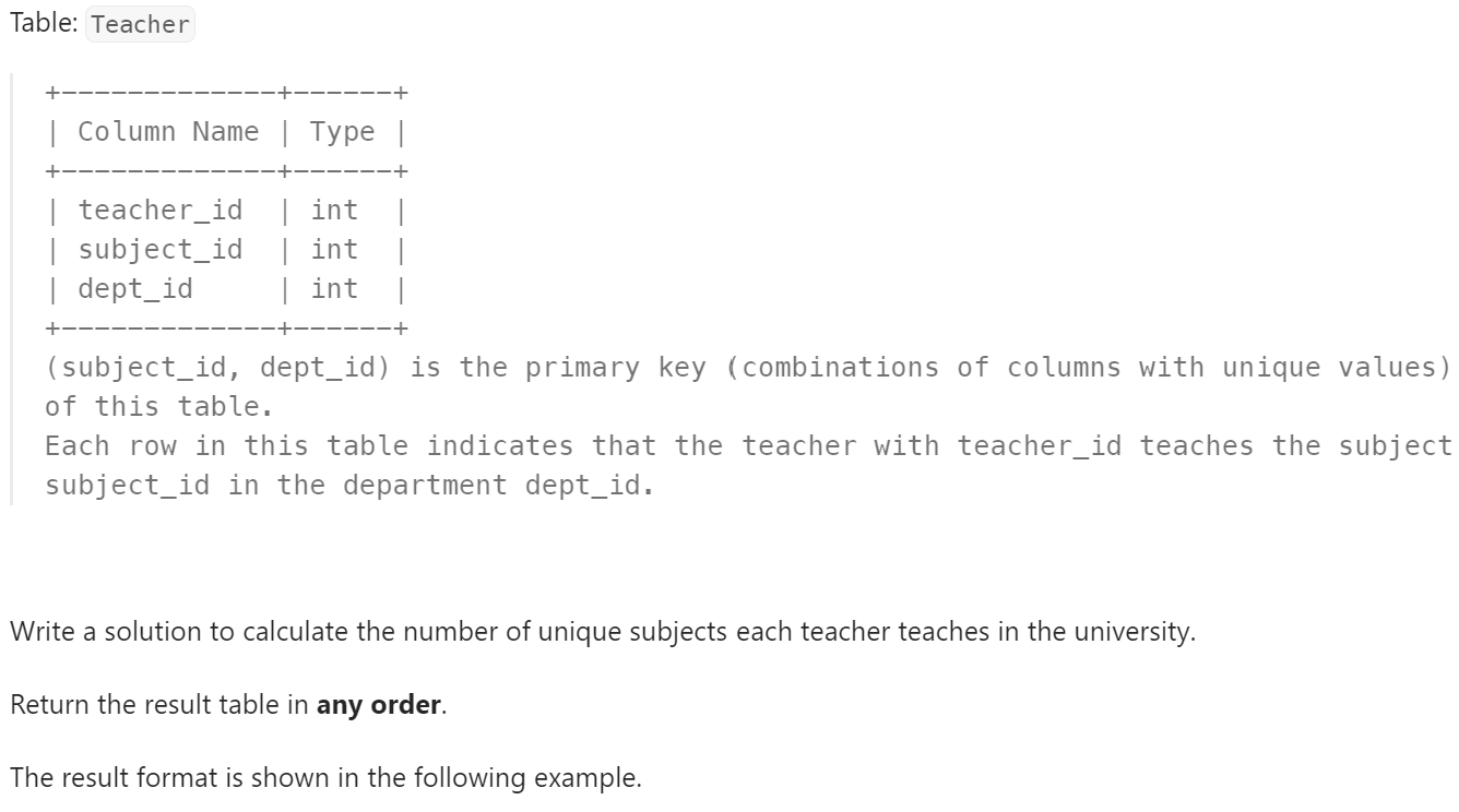 Number of Unique Subjects Taught by Each Teacher _ Easy. LeetCode