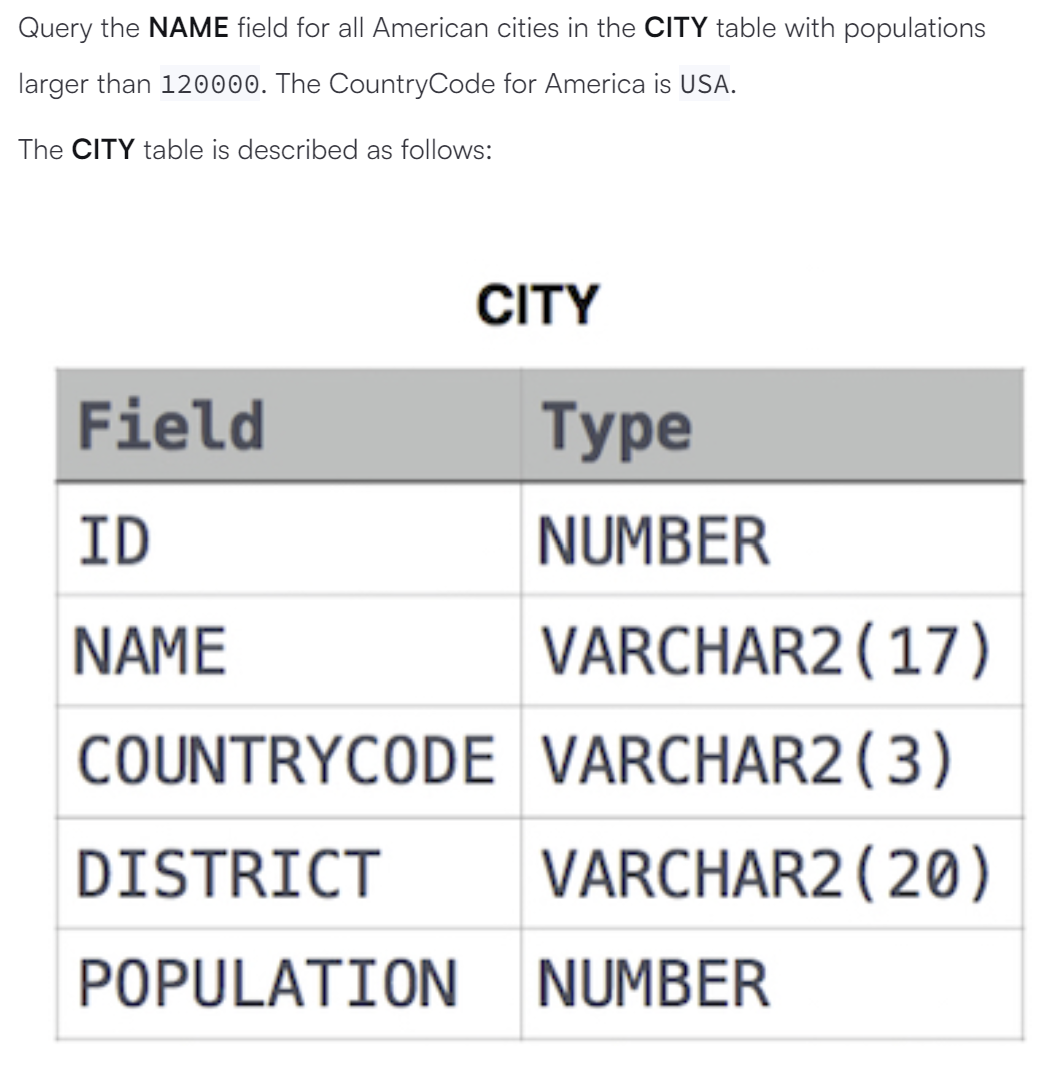AND COUNTRYCODE = 'USA';'SQL > 문제풀이' 카테고리의 다른 글