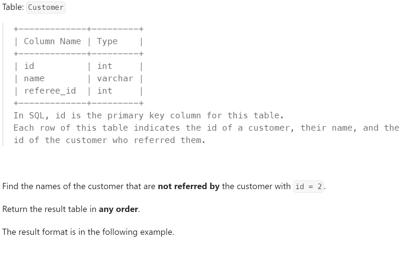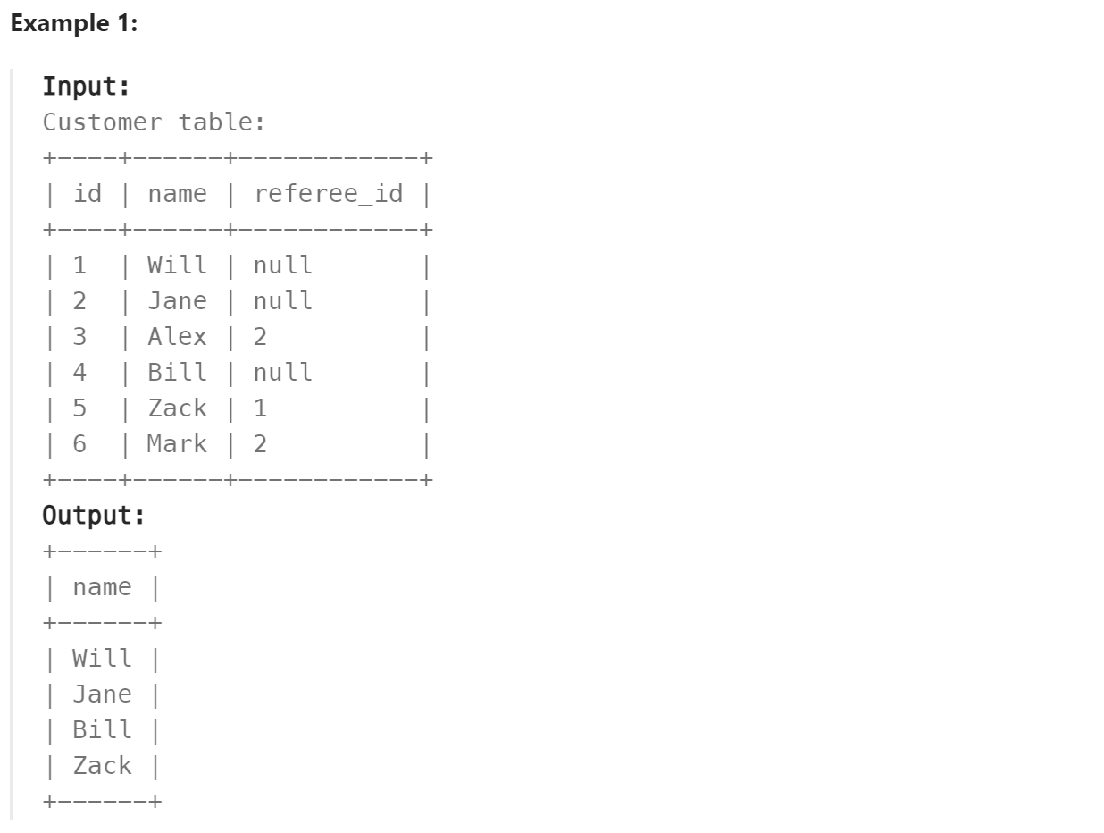 맨 처음에 'refereee_id != 2'만 쓰면 2가 아닌 모든 것을 출력할 것 같아 코드를 실행했는데 NULL은 포함이 되지 않았다. 찾아보니 SQL에서 NULL은 값이 없는 상태를 의미하기 때문에 '!= 2'로 비교할 수 없었다. 따라서 NULL 값도 포함해야 한다. NULL 값을 포함하기 위해서는 'IS NULL'을 사용하면 된다.