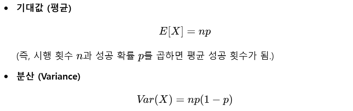 - 각 시행은 베르누이 시행 (즉, 성공/실패의 두 가지 결과만 존재).