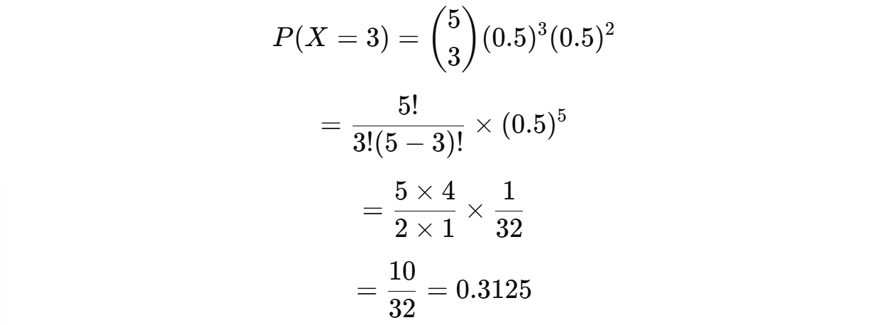 동전을 5번 던졌을 때 앞면이 정확히 3번 나올 확률은 31.25%이다.