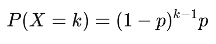 첫 성공이 k번째 시행에서 나올 확률은, k−1번의 실패 후 성공하는 경우이다.