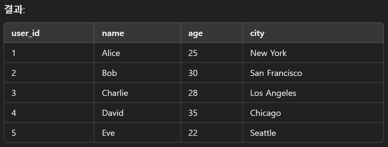 (5, 'Eve', 22, 'Seattle');