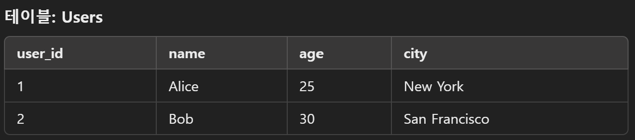 INSERT INTO Users (user_id, name, age, city)
