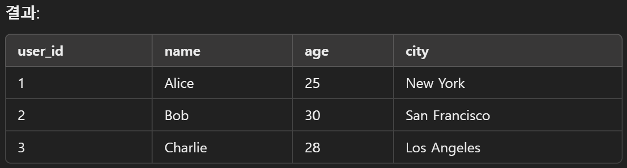VALUES (3, 'Charlie', 28, 'Los Angeles');