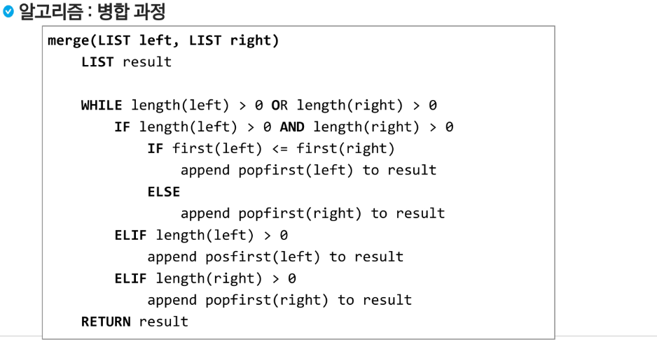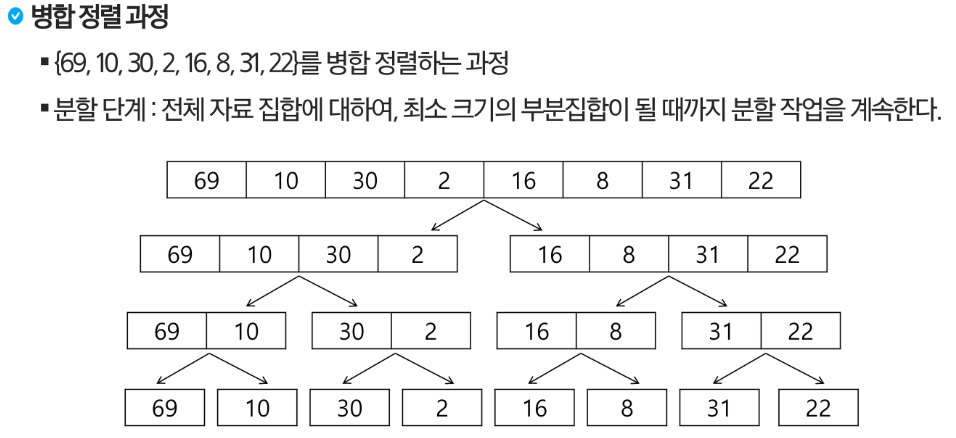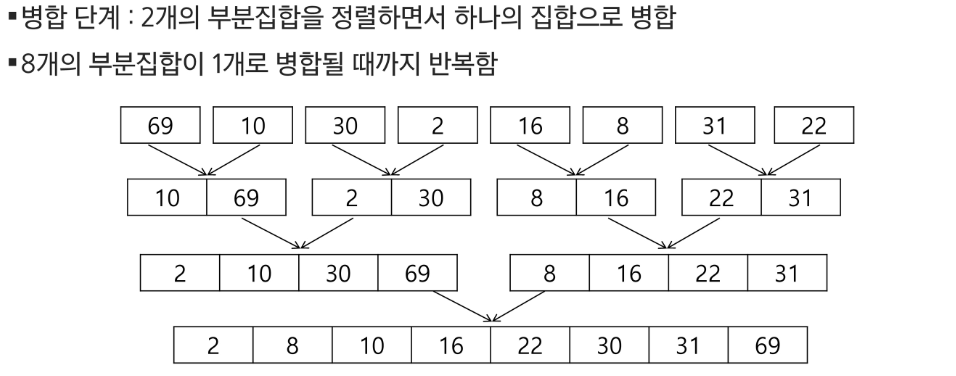 - 여러 개의 정렬된 자료의 집합을 병합하여 한 개의 정렬된 집합으로 만드는 방식입니다.