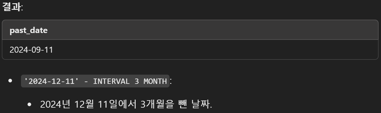 SELECT '2024-12-11' - INTERVAL 3 MONTH AS past_date;