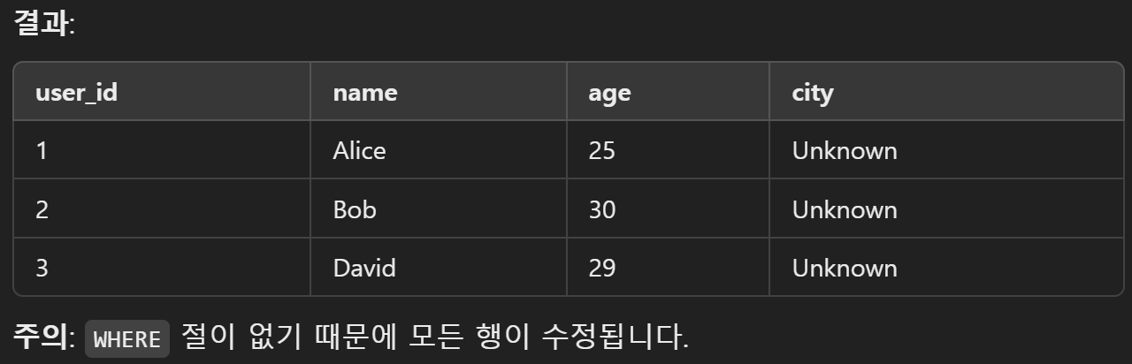 - WHERE condition: 업데이트할 행을 지정하는 조건. 조건이 없으면 테이블의 모든 행이 업데이트됩니다.