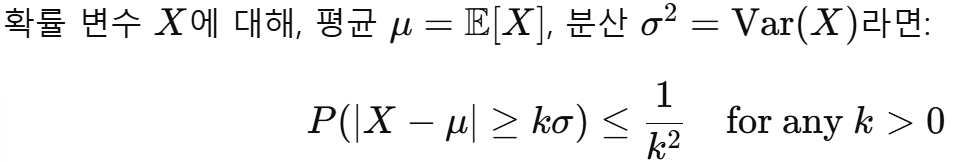 확률 분포의 기댓값과 분산만 알면, 확률 변수가 기댓값에서 얼마나 벗어날 수 있는지를 상한으로 제시해 주는 강력한 불평등식이다.