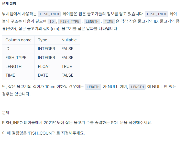 한 해에 잡은 물고기 수 구하기 _ Lv1. 프로그래머스 본문