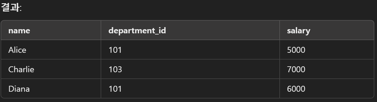 - 하나 이상의 조건이 참(True) 일 경우 해당 행이 결과에 포함됩니다.