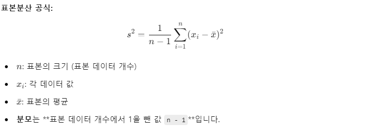 - 표본분산(Sample Variance): 표본분산은 모집단의 일부 표본을 사용해 분산을 추정할 때 사용된다. 전체 모집단을 알 수 없고, 일부 표본만 가지고 있을 때, 그 표본에서 분산을 계산할 때 사용된다.