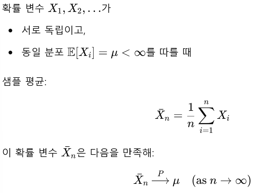 약한 대수의 법칙(Weak Law of Large Numbers, WLLN)은 샘플 평균이 모평균에 확률수렴한다는 것을 보장하는 법칙이다.