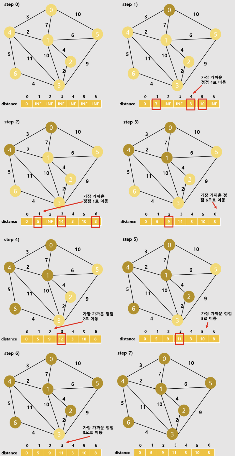 if distance < distances[neighbor]: # 최단 거리 갱신