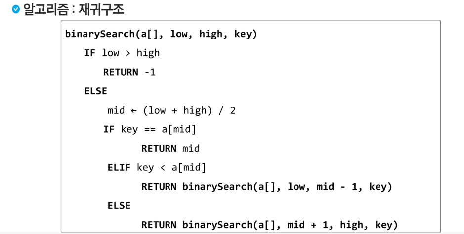 - 목적 키를 찾을 때까지 이진 검색을 순환적으로 반복 수행함으로써 검색 범위를 반으로 줄여가면서 보다 빠르게 검색을 수행합니다.
