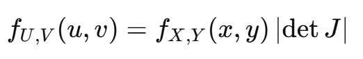 이때, 새로운 확률 밀도 함수 fU,V(u,v)f_{U,V}(u,v)는 다음과 같이 계산된다: