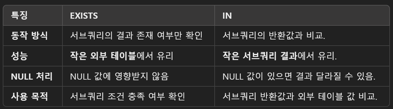 - EXISTS는 서브쿼리의 결과 행 개수와 상관없이, 첫 번째로 확인되는 결과가 있을 때 즉시 TRUE를 반환하므로 효율적입니다.