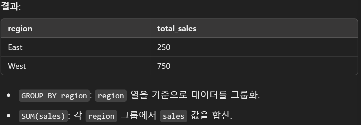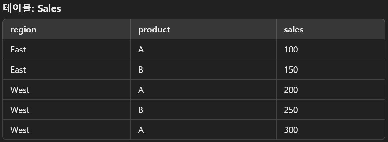 문제: 각 지역별 총 매출 합계를 구하려면?