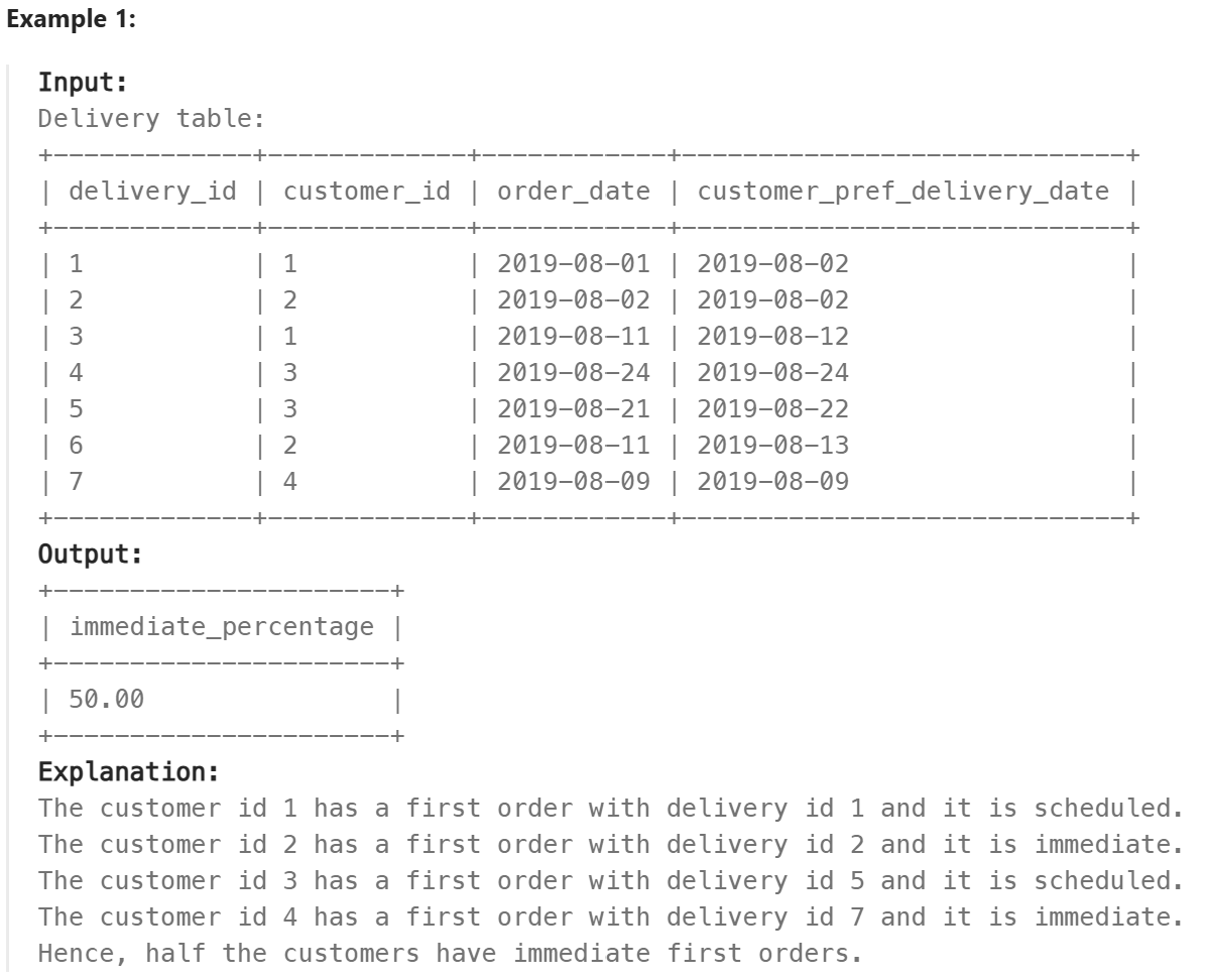 SELECT ROUND(AVG(order_date = customer_pref_delivery_date) * 100, 2) AS immediate_percentage