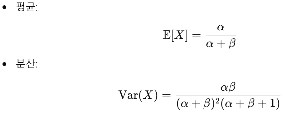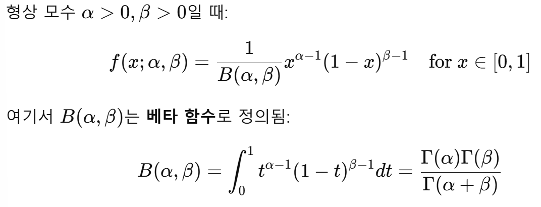 베타 분포(Beta Distribution)는 [0, 1] 구간에서 정의되는 연속 확률 분포이다.