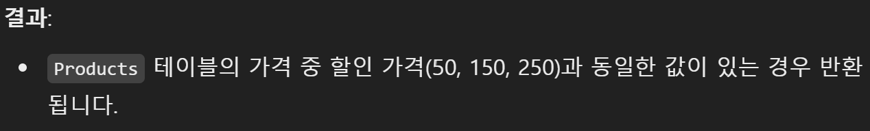 - ANY: 서브쿼리에서 반환된 값 중 하나라도 조건을 만족하면 참.