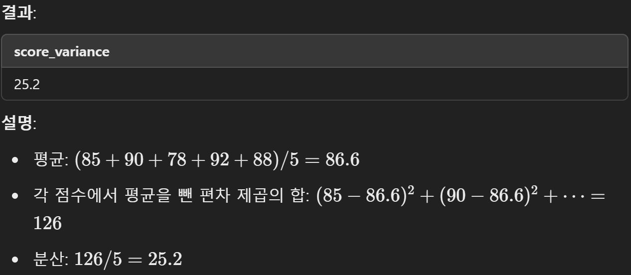- SQL에서 기본적으로 제공되는 VARIANCE 함수는 모분산을 계산합니다.