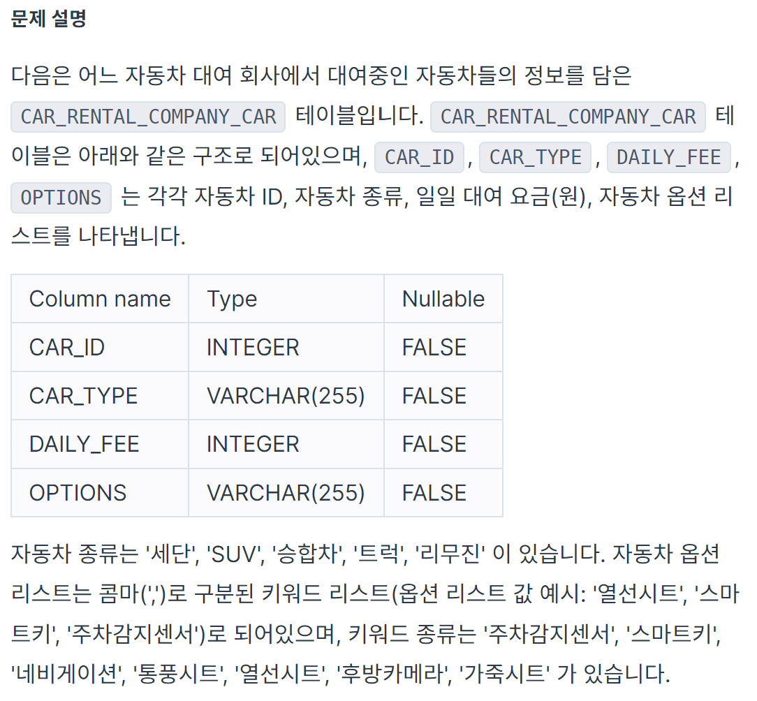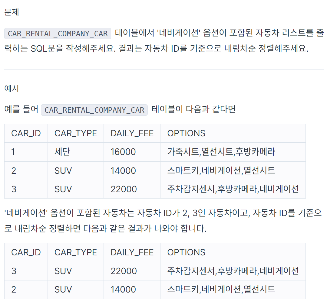 특정 옵션이 포함된 자동차 리스트 구하기 _ Lv1. 프로그래머스 본문