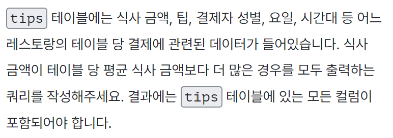 이 문제는 WHERE 절에는 집계함수를 사용하면 안 된다는 조건 때문에 검색을 해야 했다. HAVING 절을 사용하려면 GROUP BY가 같이 있어야 하는데 이 문제에서는 GROUP BY를 사용할 필요가 없어서 그럼 어떻게 평균값을 구할지 검색했다. 저렇게 쿼리 구문안의 쿼리 느낌으로 작성하면 된다.