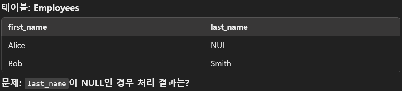 - **CONCAT**에 NULL 값이 포함되면, 결과는 NULL이 됩니다.