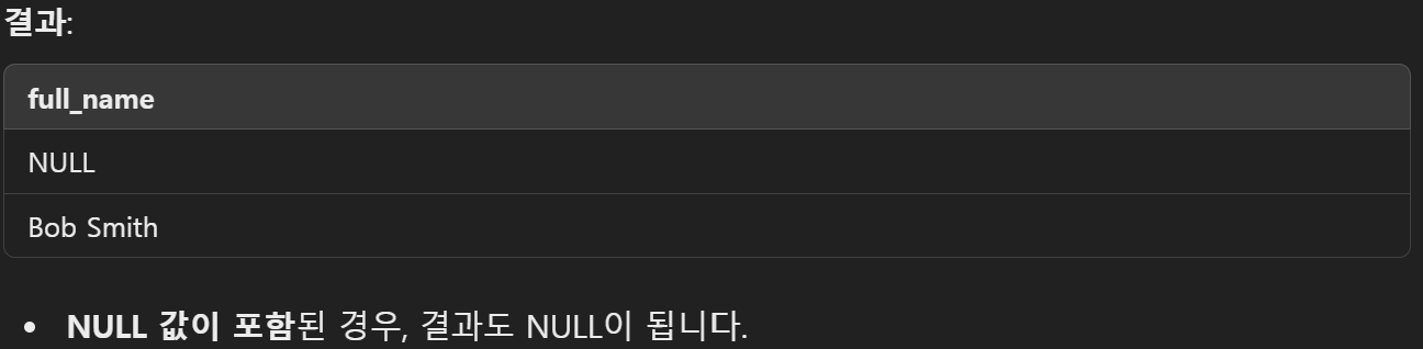 - **CONCAT**에 NULL 값이 포함되면, 결과는 NULL이 됩니다.
